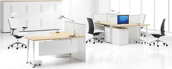 ※  各类桌面造型可供选择,并由匹配的抽屉柜、边桌和矮柜构成和谐的办公系统。沉稳的色调彰显了使用者的专业形象。