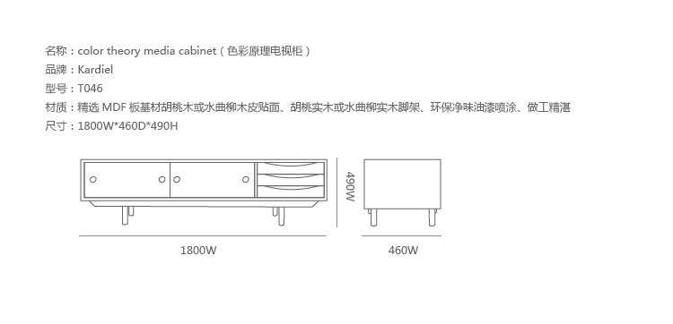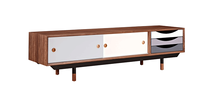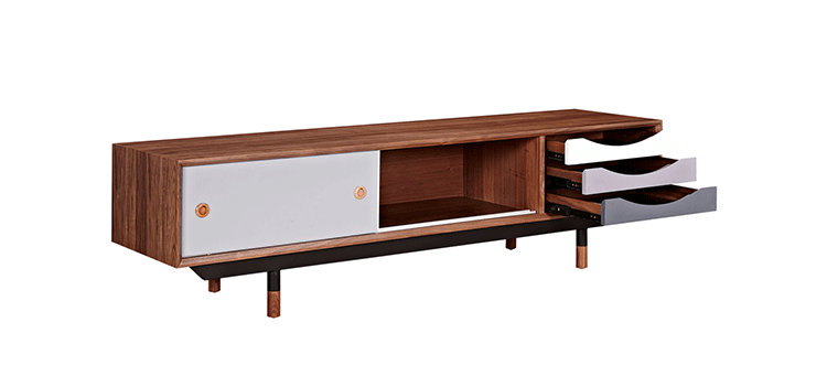 color theory media cabinet(色彩原理电视柜)是Kardiel公司制作的经典实木家具,具有世纪中期的现代风格,设计于1955年。配有三个梯度的滑动抽屉和两个隐蔽的推拉门的小隔间,存储容量非常大。在现代主义的存储家具上, Finn Juhl和 Arne Vodder 最先尝试胶木和天然木的组合运用。这是大胆的创新,他们结合传统的新鲜的新兴技术与现代主义的概念。制作采用精选MDF板基材胡桃木或水曲柳木皮贴面、胡桃实木或水曲柳实木脚架、环保油漆喷涂、做工精湛,是您理想的选择。